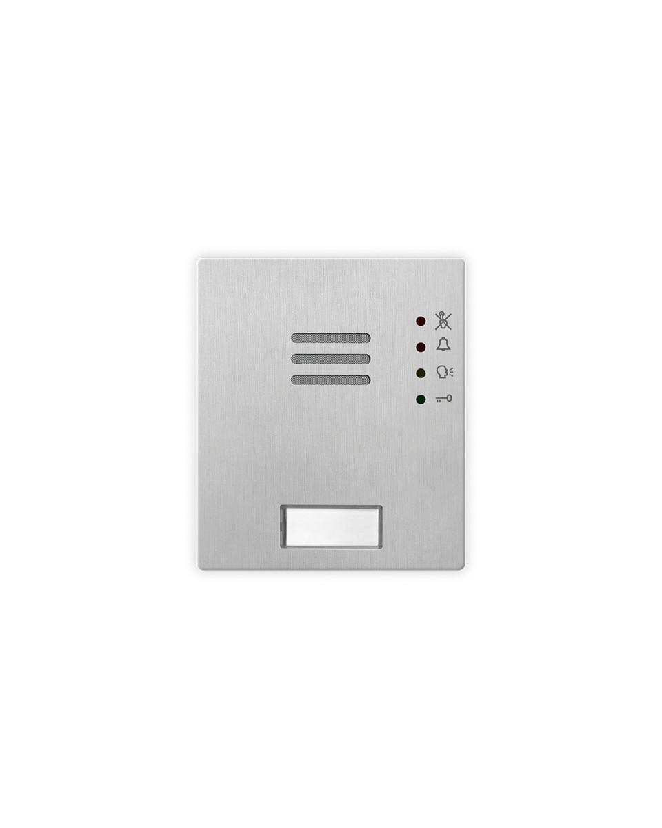 Modulo audio 0 pulsanti per sistema GSM. Modulo audio a 0 pulsanti serie 4000 per sistema GSM, connessione 4G/3G/2G, 1 microfono integrato, 1 altoparlante integrato 8Ω/2W, amplificatore in classe D da 1W. Funzione audio full-duplex (AEC) con riduzione digitale del rumore/disturbo. Lettore di prossimità RFID integrato (125kHz: EM4100/EM4102) per l’utilizzo fino a 1.000 chiavi cod. 955/T oppure card ISO3, la configurazione chiavi avviene attraverso PC utilizzando software GSMPRO. Fino a 400 codici permanenti e 32 temporanei per gli accessi codificati ( se utilizzati con il cod. 4903 attraverso RS-485). Possibilità di collegare in locale un pulsante apriporta. Connettore IDC per il collegamento tramite cavo flat (in dotazione) con altri moduli opzionali (massimo 8 moduli per un totale di 40 pulsanti), oppure fino a 50 pulsanti tramite morsettiera. 4 LED di segnalazione visiva di stato impianto: occupato, chiamata in corso, comunicazione aperta e apertura porta. Segnalazioni acustiche per ipovedenti: comunicazione aperta e apertura porta. Tempo di apertura porta e conversazione configurabili. 1 relè di serie a contatti puliti C-NO-NC (max 24Vac/dc - 2A), 2 uscite open collector, 3 ingressi ausiliari. 1 porta bus RS-485, 1 porta micro-USB. Livelli del microfono e dell’ altoparlante regolabili. Retroilluminazione del cartellino informativo con LED di colore blu. Microfono da alloggiare nel vano specifico dei telai porta moduli che consente una migliore resa fonica anche in ambienti rumorosi azzerando inoltre eventuali problemi di effetto larsen. 4 numeri tele- fonici (1 primario, 3 deviazioni) da abbinare ad ogni pulsante di chiamata/utenza. Fino a 1.000 utenti con funzione dial to open (chiama per aprire). 4.000 log eventi in locale ed illimitati con accesso da remoto. Placca in acciaio inox satinato AISI 316 (marine grade) che conferisce durabilità in installazioni soggette ad agenti atmosferici e in prossimità di ambienti marini. Placca antivandalica IK07 e grado di protezione IP65. Temperatura di esercizio -20°/+60°C. Alimentazione 12Vcc / 12Vac ± 10%/400mA. Configurazione semplificata del dispositivo attraverso software GSMPRO in locale o remoto, oppure attraverso SMS. Necessita di installazione antenna cod. 434. Dimensioni 103x120x43mm. Ingombro 1 modulo.