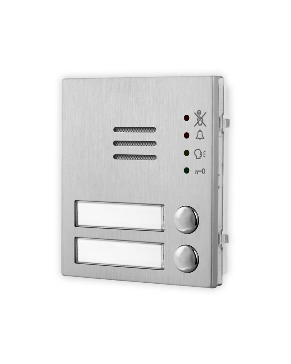 Modulo audio 2 pulsanti per sistema GSM. Modulo audio a 2 pulsanti serie 4000 per sistema GSM, connessione 4G/3G/2G, 1 microfono integrato, 1 altoparlante integrato 8Ω/2W, amplificatore in classe D da 1W. Funzione audio full-duplex (AEC) con riduzione digitale del rumore/disturbo. Lettore di prossimità RFID integrato (125kHz: EM4100/EM4102) per l’utilizzo fino a 1.000 chiavi cod. 955/T oppure card ISO3, la configurazione chiavi avviene attraverso PC utilizzando software GSMPRO. Fino a 400 codici permanenti e 32 temporanei per gli accessi codificati ( se utilizzati con il cod. 4903 attraverso RS-485). Possibilità di collegare in locale un pulsante apriporta. Connettore IDC per il collegamento tramite cavo flat (in dotazione) con altri moduli opzionali (massimo 8 moduli per un totale di 40 pulsanti), oppure fino a 50 pulsanti tramite morsettiera. 4 LED di segnalazione visiva di stato impianto: occupato, chiamata in corso, comunicazione aperta e apertura porta. Segnalazioni acustiche per ipovedenti: comunicazione aperta e apertura porta. Tempo di apertura porta e conversazione configurabili. 1 relè di serie a contatti puliti C-NO-NC (max 24Vac/dc - 2A), 2 uscite open collector, 3 ingressi ausiliari. 1 porta bus RS-485, 1 porta micro-USB. Livelli del microfono e dell’ altoparlante regolabili. Retroilluminazione del cartellino informativo con LED di colore blu. Microfono da alloggiare nel vano specifico dei telai porta moduli che consente una migliore resa fonica anche in ambienti rumorosi azzerando inoltre eventuali problemi di effetto larsen. 4 numeri tele- fonici (1 primario, 3 deviazioni) da abbinare ad ogni pulsante di chiamata/utenza. Fino a 1.000 utenti con funzione dial to open (chiama per aprire). 4.000 log eventi in locale ed illimitati con accesso da remoto. Placca in acciaio inox satinato AISI 316 (marine grade) che conferisce durabilità in installazioni soggette ad agenti atmosferici e in prossimità di ambienti marini. Placca antivandalica IK07 e grado di protezione IP65. Temperatura di esercizio -20°/+60°C. Alimentazione 12Vcc / 12Vac ± 10%/400mA. Configurazione semplificata del dispositivo attraverso software GSMPRO in locale o remoto, oppure attraverso SMS. Necessita di installazione antenna cod. 434. Dimensioni 103x120x43mm. Ingombro 1 modulo.
