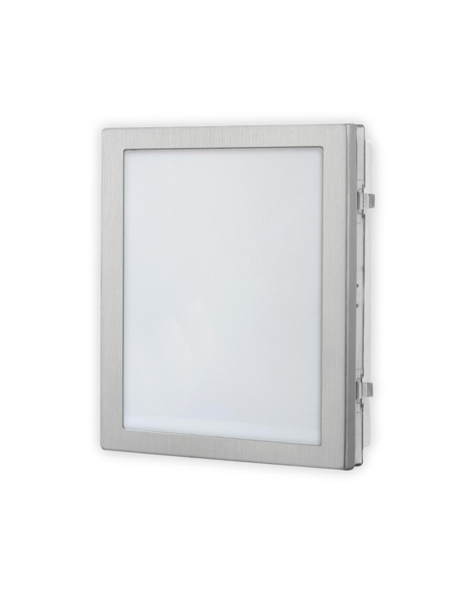Modulo informativo comune a tutti i sistemi Modulo informativo serie 4000 per sistemi IPure, VX2300 e GSM. Retroilluminazione a LED blu. Cornice in acciaio inox satinato AISI 316 (marine grade) che conferisce durabilità in installazioni soggette ad agenti atmosferici e in prossimità di ambienti marini, coperchio in policarbonato trasparente (83x104mm), cartellino scrivibile (96x113mm). Placca antivandalica IK07 e grado di protezione IP65. Temperatura di esercizio -20°/+60°C. Alimentazione 12Vdc - 30mA. Dimensioni 103x120x43mm. Ingombro 1 modulo.