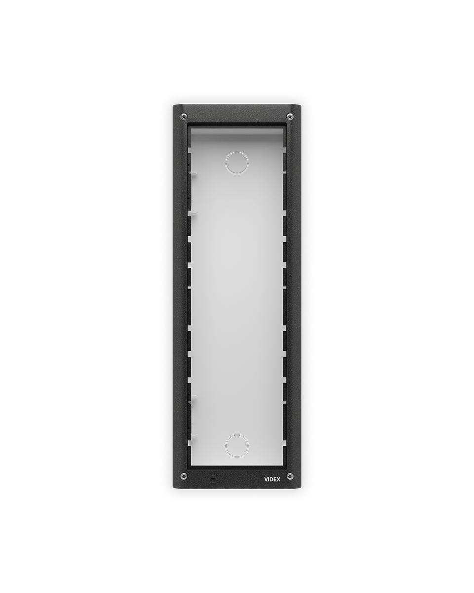 Kit installazione da incasso 3 moduli. Composto da: scatola da incasso e telaio portamoduli. Il telaio comprende 4 viti di sicurezza tipo Torx, una guarnizione anti-infiltrazioni e cerniere laterali per consentire l’apertura del telaio per l’installazione o ispezione. Dimensione scatola: 120x383x45mm, dimensione telaio:135x400x17mm, colore grigio canna di fucile.