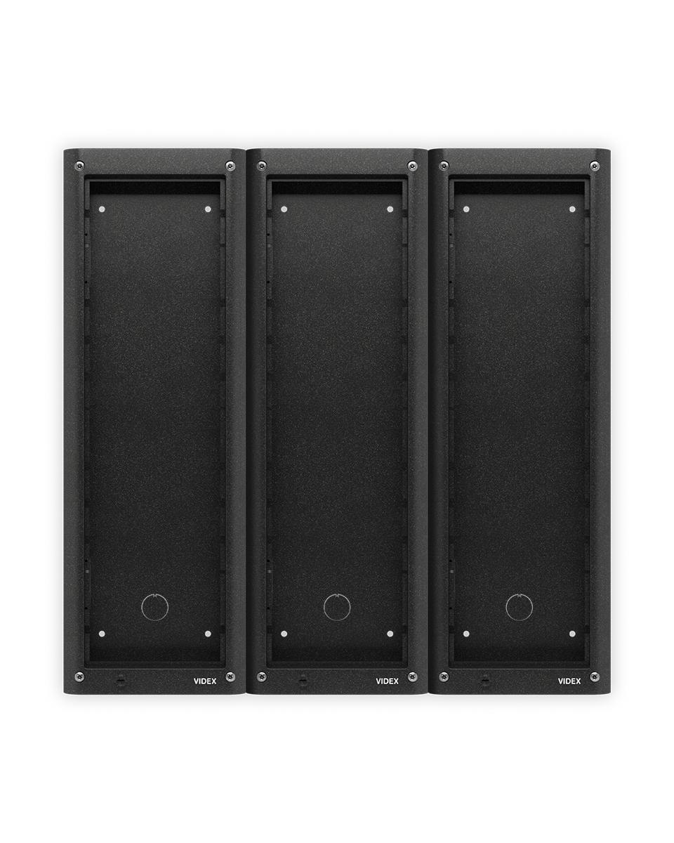 Kit installazione da parete 9 moduli. Composto da: scatola da superficie e telaio portamoduli. Il telaio comprende 12 viti di sicurezza tipo Torx, una guarnizione anti-infiltrazioni e cerniere laterali per consentire l’apertura del telaio per l’installazione o ispezione. Dimensioni 405x400x44mm, colore grigio canna di fucile.