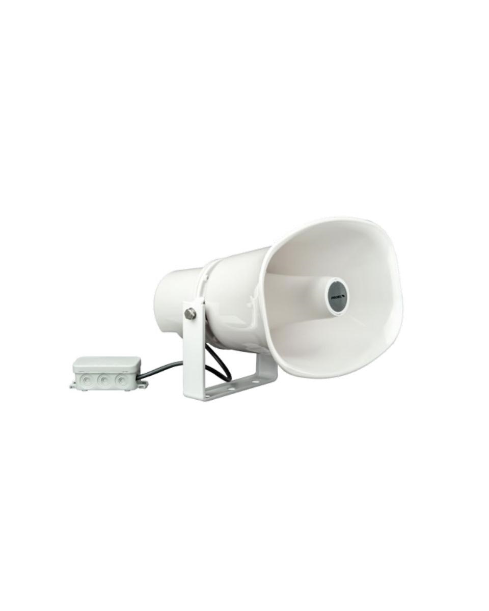 Altoparlante a Tromba. Altoparlanti: 1.4” driver a compressione Potenza nominale @ 8Ω: 30 W. Potenza nominale 100h: 30 W. Potenza @ 100V: 30 / 15 / 7.5 / 3.75 W Potenza @ 70V: 30 / 15 / 7.5 / 3.75 / 1.9 W Impedenza:8 Ω. 333 / 666 / 1.33k / 2.67k Ω @ 100V. 163 / 333 / 666 / 1.33k / 2.67k Ω @ 70V Connettore: Terminale in ceramica. Selezione Potenza: Selettore Rotativo. Risposta in Frequenza (-10 dB): 290 - 11k Hz. Sensibilità a 1 W* (Pink, 1m / 4m): 104 / 92 dB. Massima SPL* (Pink, 1m / 4m): 119 / 107 dB Angolo di Copertura a 500 / 1k/2k/4kHz(-6dB):180°/100°/80°/45° Finitura: Bianco (RAL 9016). Materiale: ABS. Tipo di Ambiente: B (IP55C). Temperature Operativa: -25 ÷ +70 °C (-13 ÷ +158 °F) Umidità Relativa: <95%. Dimensioni (mm):285 x 280 x 205 (L x A x P). Montaggio: a parete - staffa inclusa. Peso: 1.9 kg (4.18 lb) Certificazione: EN54-24:2008