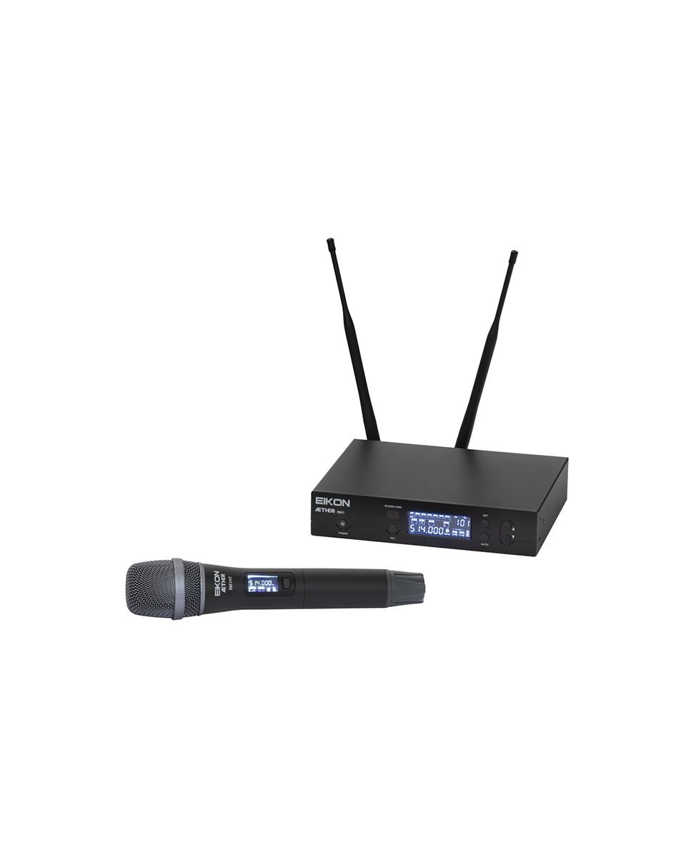 Radiomicrofono UHF diversity PLL per uso professionale È dotato di autoscan e sincronizzazione IR. 388 canali per l’uso simultaneo fino a 24 unità. Portata 100 metri. Custodia in ABS. Range: 823-865 Mhz (AETHERRM1MD) Trasmettitore a mano con capsula supercardioide