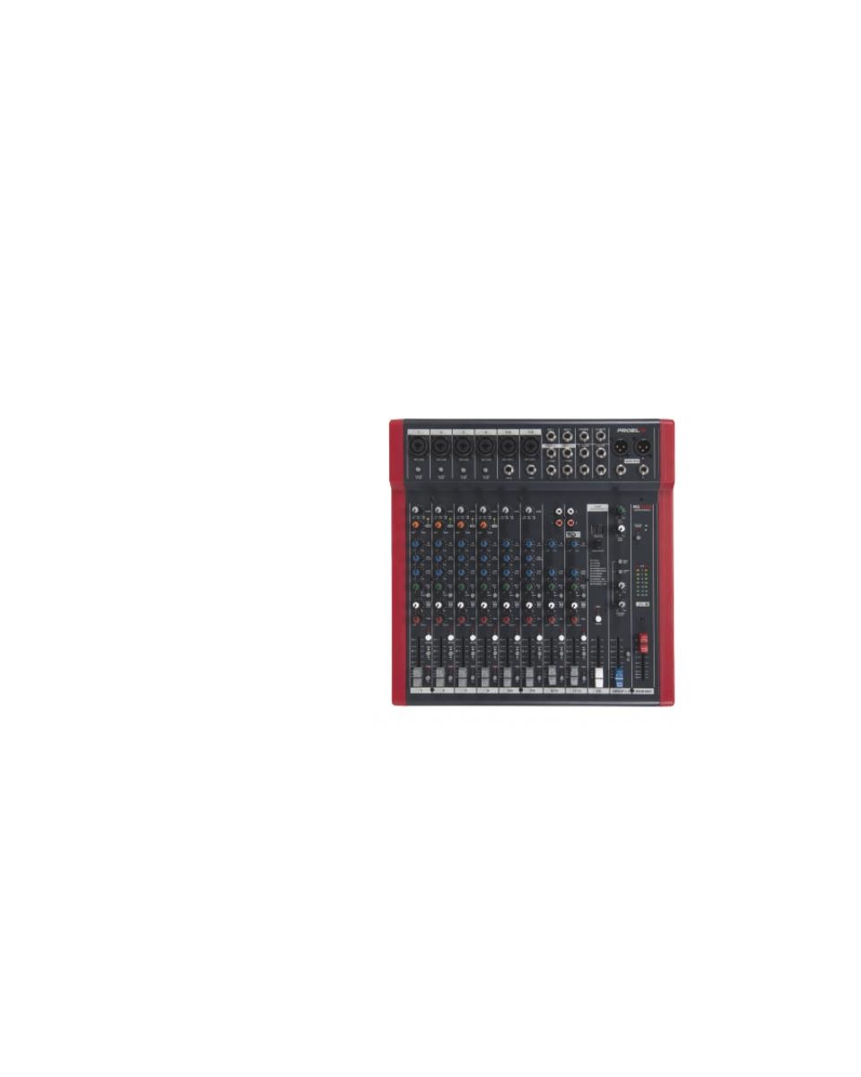 Mixer compatto a 12 ingressi e 4 bus di uscita con effetto e I/F USB 4 ingressi MONO MIC/LINE, 2 ingressi STEREO MIC/LINE e 2 ingressi STEREO LINE. 6 pre-amplificatori microfonici a basso rumore ed altissima dinamica. Alimentazione PHANTOM. COMPRESSORE a controllo singolo e LED di segnalazione sui canali MONO. EQ a 3 bande con medi semi-parametrici e filtro LO-CUT. 1 mandata AUX pre-fader e 1 mandata AUX post-fader. Effetto digitale studio-grade a 24bit con 100 presets, display 2-digit e MUTE a pedale. Interfaccia USB per registrazione e riproduzione da PC. GROUP 1&2 con assegnazione MIX e uscita. Uscite HEADPHONES e CONTROL ROOM. Uscite MAIN MIX bilanciate elettronicamente con connettori XLR-M e JACK. Due VU-METERS a 8 LED. Alimentatore switching universale 100-250V. Costruzione accurata e chassis ultra-robusto.