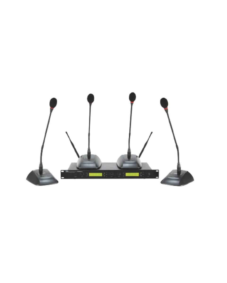 Sistema di Discussione senza fili composto di unità ricevente DWS corredata di quattro basi wireless BMW e di carica batterie. Doppio Display. Tasti di navigazione. Controllo del livello di ogni singola base microfonica Tecnologia all’infrarosso per l’impostazione della frequenza operativa. Uscita Bilanciata e sbilanciata mixata .Singole uscite per ogni canale. Modalità frequenze canalizzate o Tuning. Controllo dello Squelch separato per ogni singola Banda Consolle wireless con display ed anello luminoso per indicare la condizione operativa. Portata: 50/60mt. Case in metallo da 1 unità rack 19” standard. Due range di frequenza disponibili: a: 610÷670 MHz