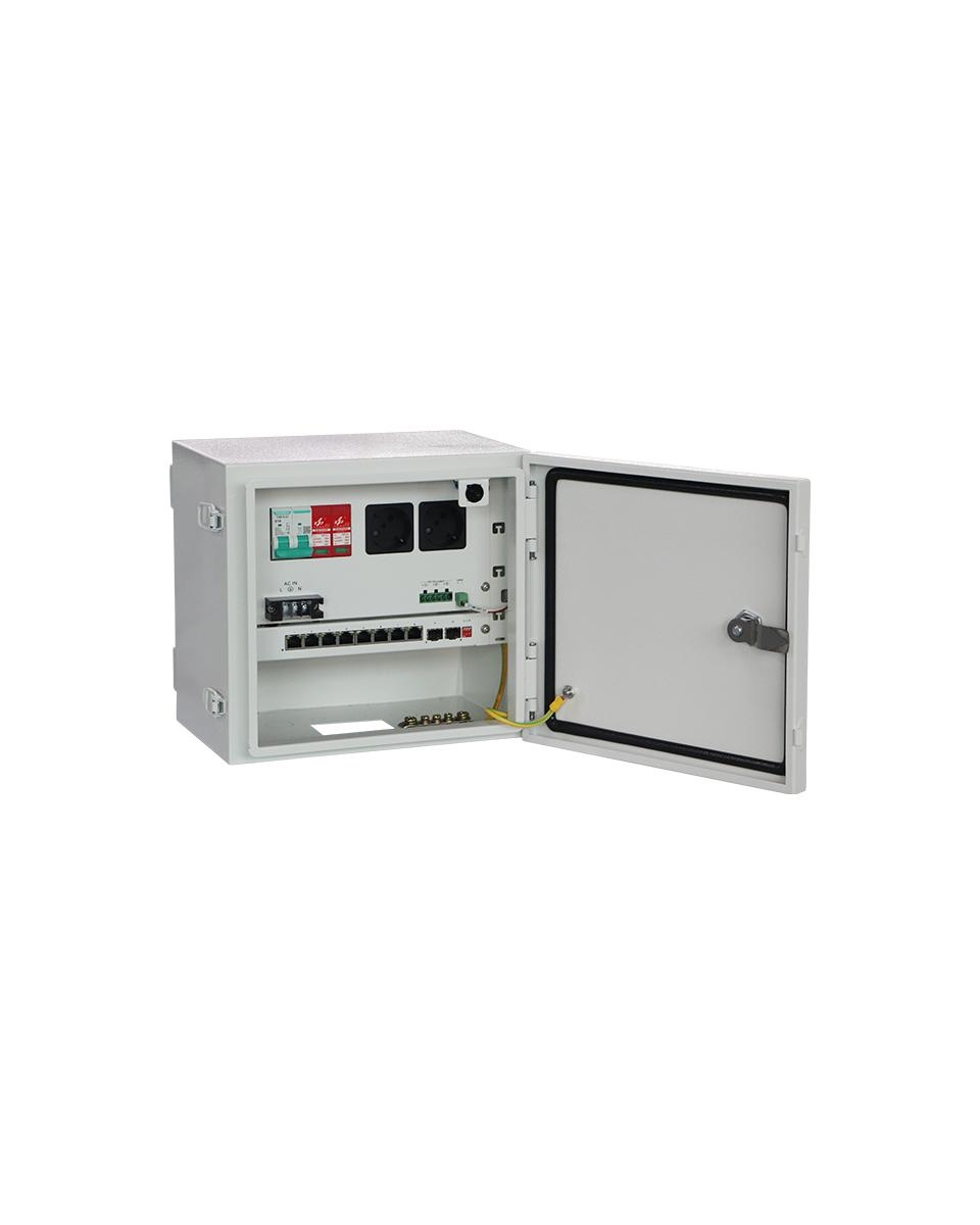 Alimentazione principale: 230 Vac con terminale a vite. Uscite alimentazione: 3 uscite alimentazione a 12Vcc Assorbimento massimo 3A. Prese di servizio: 2 multiprese shuko 230Vac .Switch: Switch unmanaged 8 porte PoE Porte 1-8: 10/100 Base-T 30W PoE RJ45 (IEEE 802.3bt, IEEE8025.3af/at) 2 porte SFP 10/100/1000Mbps Modalità TVCC 250m.Protezione: Interruttore magnetotermico 10A. Scaricatore di terra: Presente Corrente nominale 16A. Temperatura di lavoro: -20° +70°C. Dimensioni: 260x280x200mm. Materiale: Lamiera zincata verniciata a polveri