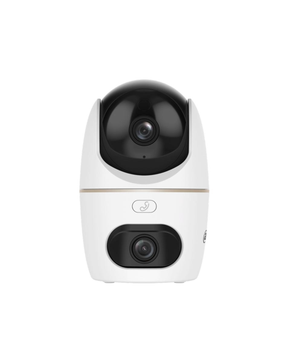 Telecamera PT IP/Wi-Fi con doppia ottica e Smart Dual Light (PT) da interno, sensori CMOS progressivi, risoluzione 2x5MP a 25fps, H.265, rotazione PAN 349° / TILT -5°~90°, ICR, ottiche fisse 3.6 mm F2.0, portata IR/white light 30 m, 1 porta di rete 10/100 Mbps, connessione Wi-Fi 6 2.4/5 G, Bluetooth pairing, microfono e speaker integrati (comunicazione bidirezionale), motion detection, AI human detection, pet detection, privacy mode, allarme luminoso e sonoro, tasto chiamata, slot micro SD card (fino a 256 GB), alimentazione 5 Vdc <5.4 W, alimentatore incluso, case in plastica